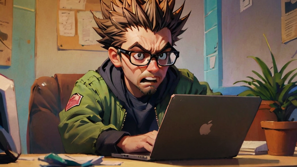 Cartoon / anime image of man with spiky hair and glasses and looking a bit panicky as he works on his laptop.